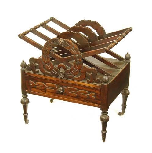 A William IV rosewood canterbury, after a design by J. C. Loudon, with three wreath divisions above a frieze drawer, on turned tapering legs and brass castors, 22in (55.6cm) h, 20in (50.5cm) w, 15.25in (38.5cm) d. Losses and restoration.
