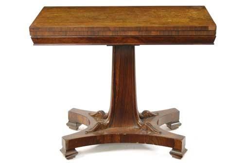 A William IV rosewood tea table, the hinged swivel top on a tapering stem with scroll supports, to a quatreform base and brass castors, 29.5in (75cm) h, 36in (91.6cm) w, 18.25in (46.3cm) d. Old wear and veneer loss.
