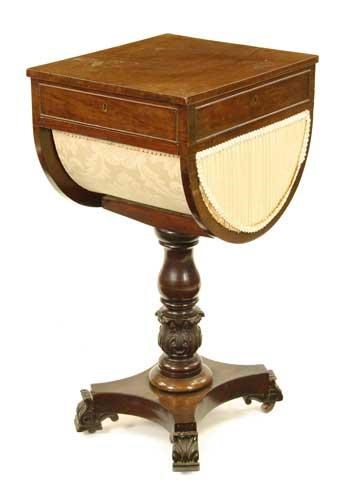 A William IV mahogany sewing table, the rectangular plum-pudding top above a frieze drawer (locked), with panelled sides above a 'U' shaped pull-out bag from the right, on a turned and petal carved stem to quatreform base, with leaf carved toes, two with losses, on ceramic castors, 33in (84cm) h, 18.5in (47cm) w, 16in (40.5cm) d.