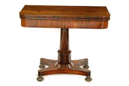A William IV rosewood card table, the hinged swivel top revealing a baize lined surface on a turned stem and a quatreform base, the disc feet to sunken brass castors, 29in (73.5cm) h, 35in (89cm) w, 17.5in (44.5cm) d.