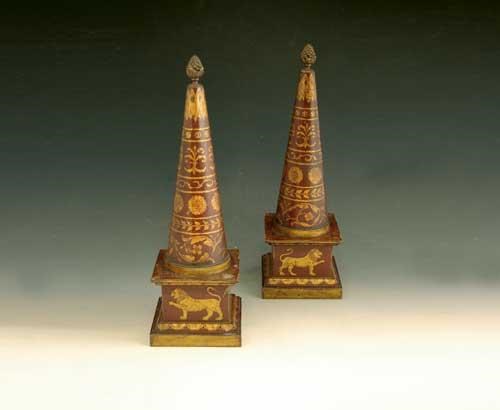 A pair of tole peinte conical obelisks, each with a pineapple finial and decorated with bands of flowers and foliage, the square bases with lions, probably French, late 19th / early 20th century, 16.75in (42.5cm) h, 5.25in (13.6cm) w. (2)