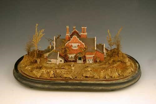 A painted card model of a house, with bay windows, Dutch gables and spiral chimney pots, on a raised naturalistic garden ground, with paths and urns on an ebonised oblong base, 7.5in (19cm) h, 16.5in (42cm) w, under a cracked glass dome.