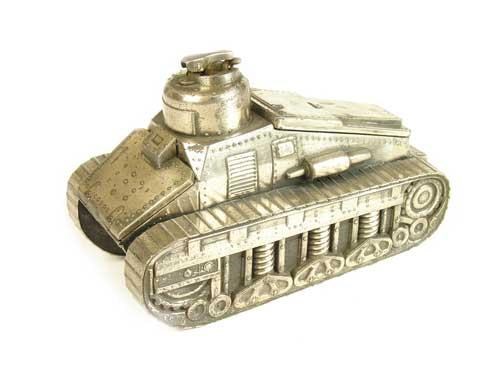 A novelty pewter cigarette case and lighter, in the form of a tank, with a hinged front and lift-off cover, 5.5in (14cm) h, 8.25in (21cm) l.