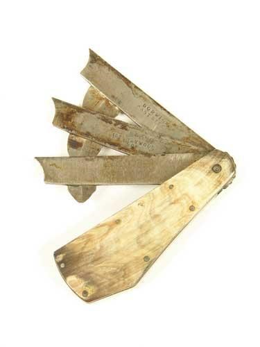 A 19th century brass and horn mounted steel blood letting phleam, with three graduated blades, by Josh Haywood & Co, 3.25in (8cm) long.