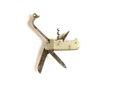 A miniature penknife, with mother of pearl scales and three blades and a corkscrew, 1.25in (3cm) l. closed.