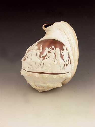 An Italian carved cameo conch shell, depicting a group of mythological figures, including Pan and Mercury, early 20th century, 8in (20cm) h.