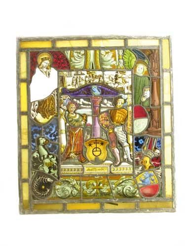A stained glass window panel, with a lead framework, depicting a gentleman and a lady flanking a shield with an orb and sceptre above a motto 'Jetter Rutarda', with landscape vignettes and mythical beasts, one panel signed 'A.W.',17th century and later, 21.25 x 19in(53.8 x 47.9cm). Damages and losses.