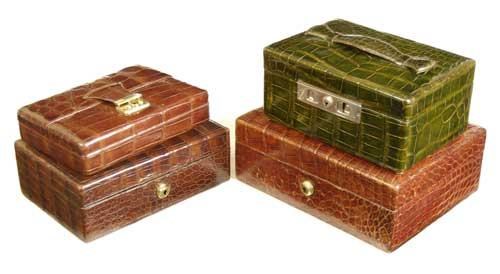 A green stained crocodile jewellery case, with chrome lock and hinges, the leather silk and plush interior with a lift out tray, 8.5in (21.5cm) w, a jewellery box with stamped initials to the top 'a.f .' (script), the interior with a lift out tray, the brass lock stamped 'BRAMAH LONDON', with key, a jewellery box with applied initials 'B.K.' with a lift out tray and a brass lock stamped 'BRAMAH PATENT' and a small jewellery case with a twin divided interior. (4)