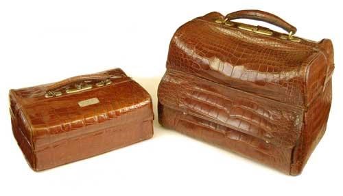 A crocodile Gladstone bag, with brass mounts having traces of plating, a side pocket and a suede lined interior, 15in (38cm) w, split to back and pocket fasteners missing, and a small Gladstone bag by J.C.Vickery, with an applied plaque initialled 'J.M.W.' the chamois leather interior with four divisions, the edge stamped 'J.C.VICKERY.179.181.183.REGENT ST W. TO THEIR MAJESTIES THE KING & QUEEN,' 12in (30.5cm) w. (2)