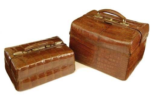 A crocodile Gladstone bag, with brass mounts and a suede lined interior, 14in (35.5cm) w, and a smaller Gladstone bag with suede interior, both with four stud feet. (2)