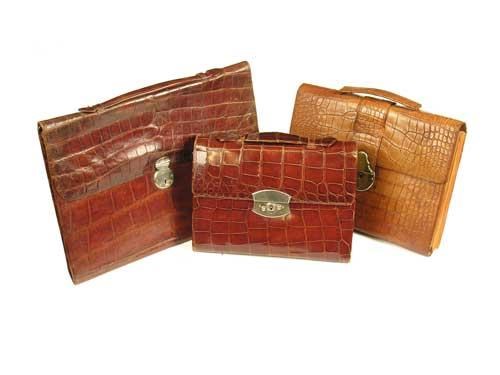A crocodile writing case by H Greaves, with brass clasp lock the hide interior with pockets and stamped 'MADE BY H.GREAVES, NEW ST BIRMINGHAM' 10.25in (26cm) w, and two similar writing cases (3)
