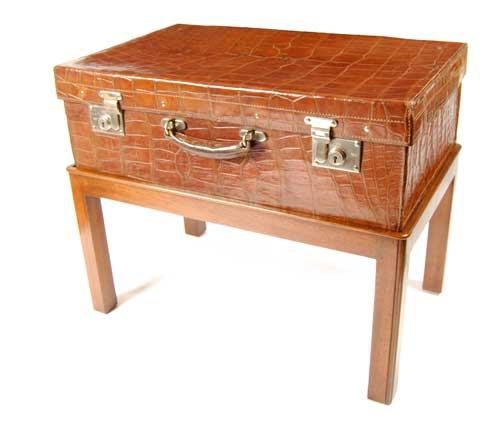 A crocodile suitcase, the cover initialled 'P.I.H.' with 'ENGLISH LEVER' locks and a watered silk interior with elasticated pockets, 26in (66cm) w, with a later mahogany stand. (2)