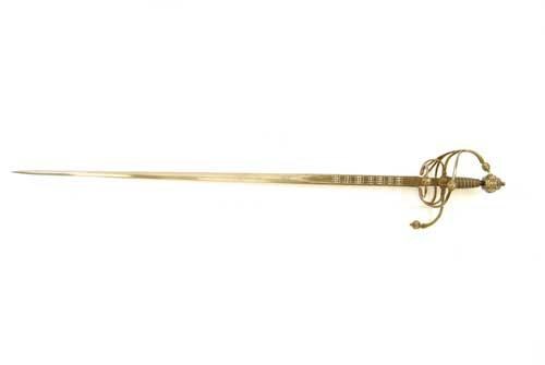 A rapier in 17th century style, with a fullered and pierced blade, inscribed 'VERVNN DOMINI,' with shield shape armourer's mark to the forte, with a wire bound grip and open hilt with faceted pommel, applied classical portrait busts, 19th century, 45.5in (115.5cm) l.