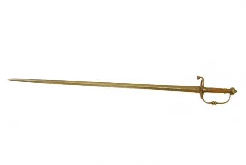 A mid 17th century trooper's sword, with a steel blade and hilt with a facetted wood grip, 39in (99cm) l.