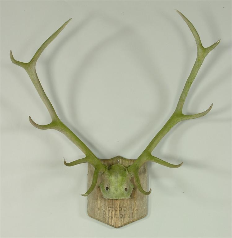 A ten point antler, mounted on an oak shield, inscribed '7 OCTOBER 1957 Balmoral', 32in (81.2cm) w and another smaller pair, with three mounted card recording seven stags shot at Balmoral Castle by Commander Wrightson. (3)