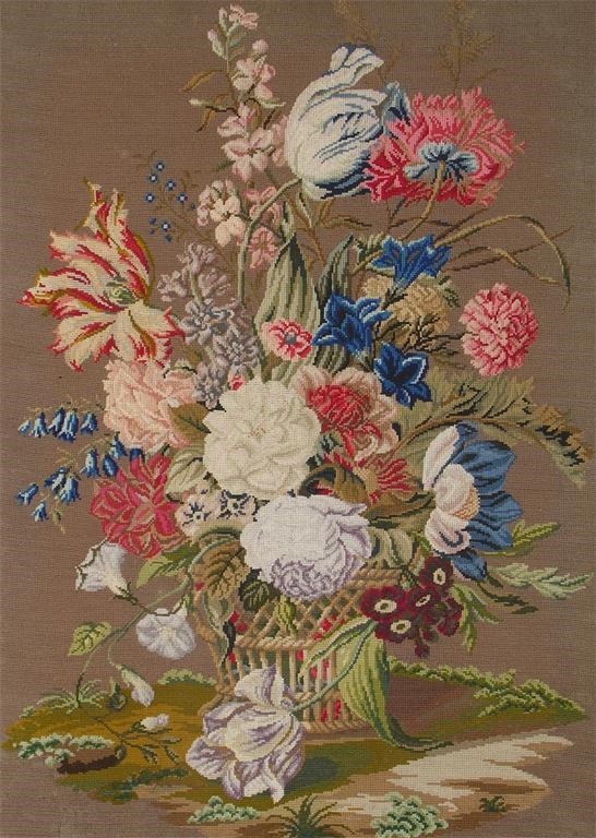 A 19th century Berlin woolwork still life, a basket of flowers, 32.5 x 23.25in (82.5 x 59cm).