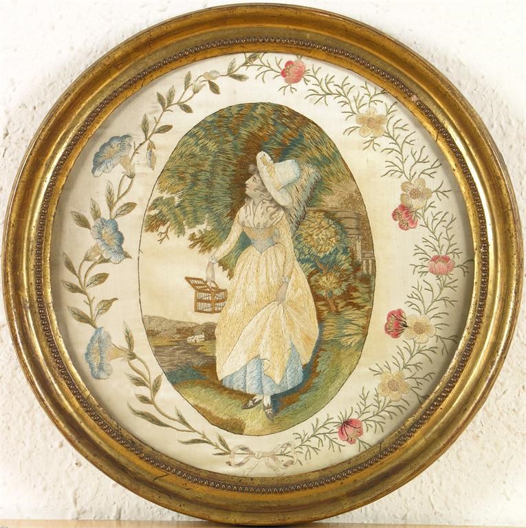 A late George III needlework picture, of a lady representing Liberty, 12in (30.4cm) dia.