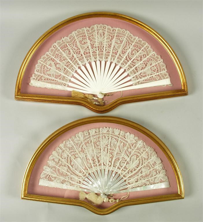 A lace and mother of pearl fan, cased, 13 x 21in (33 x 53.2cm) and another with ivory sticks. (2)