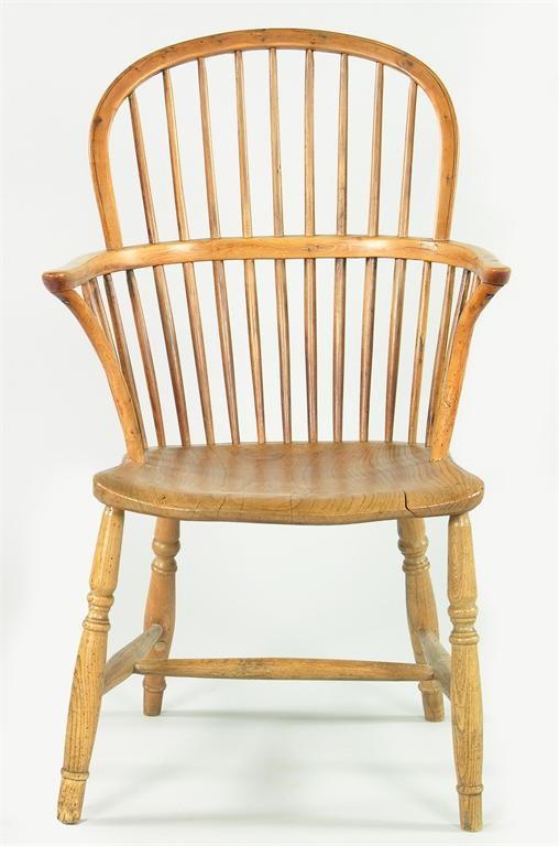 A Victorian yew, elm and fruitwood low back Windsor armchair, one back leg later.