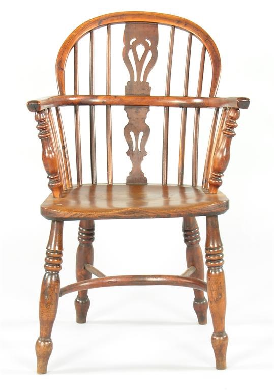 An early 19th century yew low back Windsor armchair, to an elm seat on turned ash legs and restored crinoline stretcher.