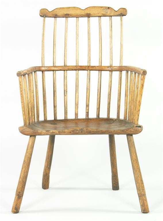 A 19th century ash and elm comb back armchair, the continuous arms on tapering supports. Seat repaired, all legs tipped.