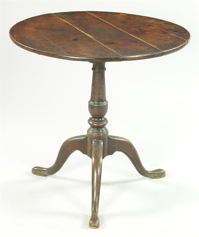 A George III fruitwood tripod table, the boarded circular tilt top on a vase turned stem, 28.25in (71.7cm) h, 28.5in (72.3cm) dia.