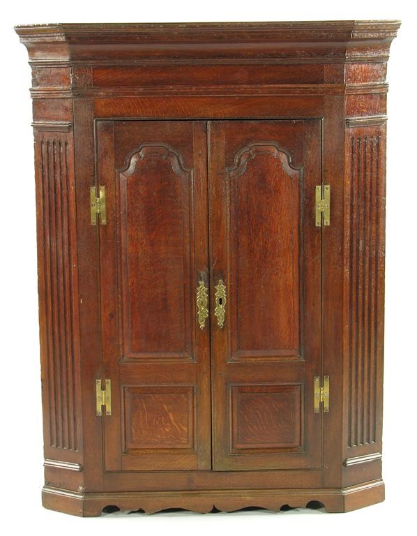 A George III oak hanging corner cupboard, with three shaped shelves, 50.25in (127.5cm) h, 38.25in (97cm) w, 24in (61cm) d.