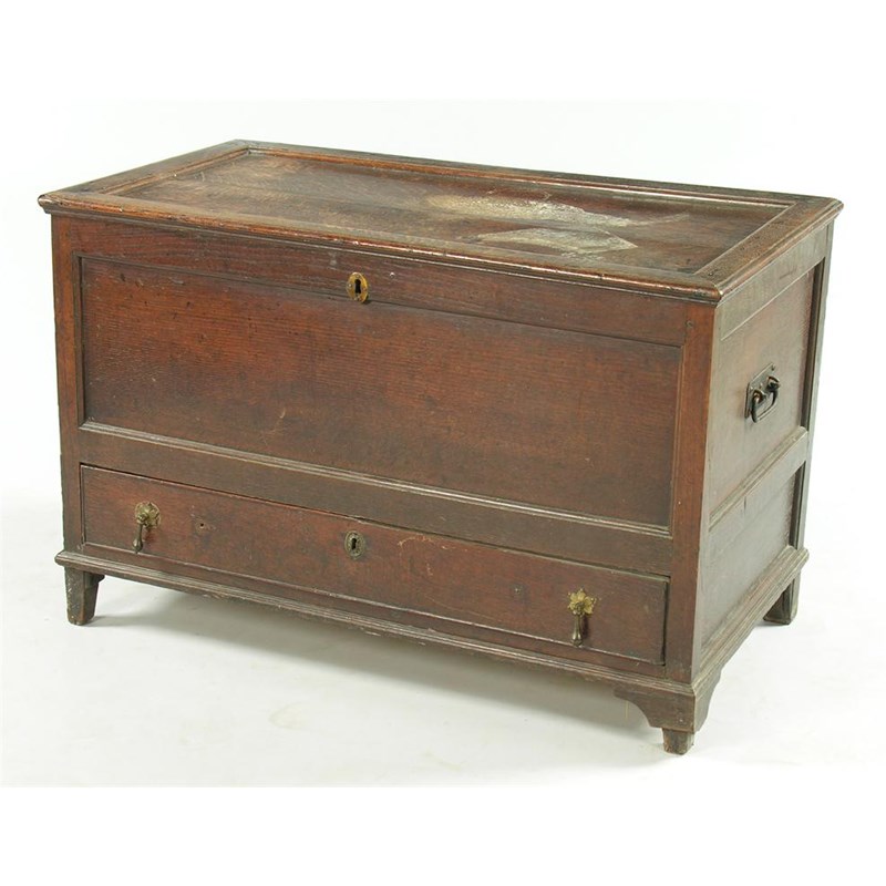 An 18th century panelled oak mule chest, the hinged top to an interior with missing base, to a drawer, later handles, 26in (66cm) h, 40in (101.5cm) w, 21.25in (54cm) d.