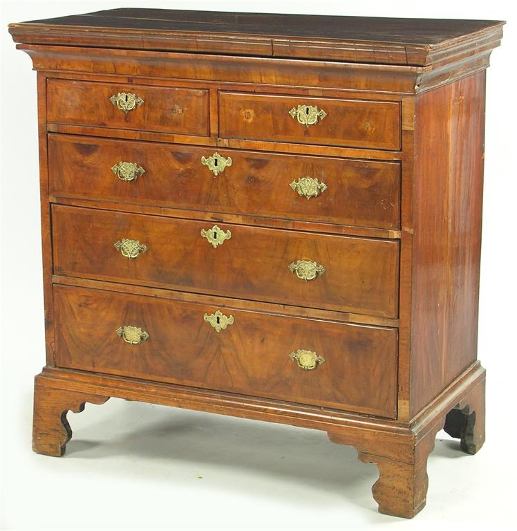 A walnut chest, the elm top, above a moulded cornice with a long drawer, to two short and three long banded drawers, fitted engraved brass plate handles, on bracket feet, 41.75in (106cm) h, 41in (104cm) w, 21.25in (54cm) d.
