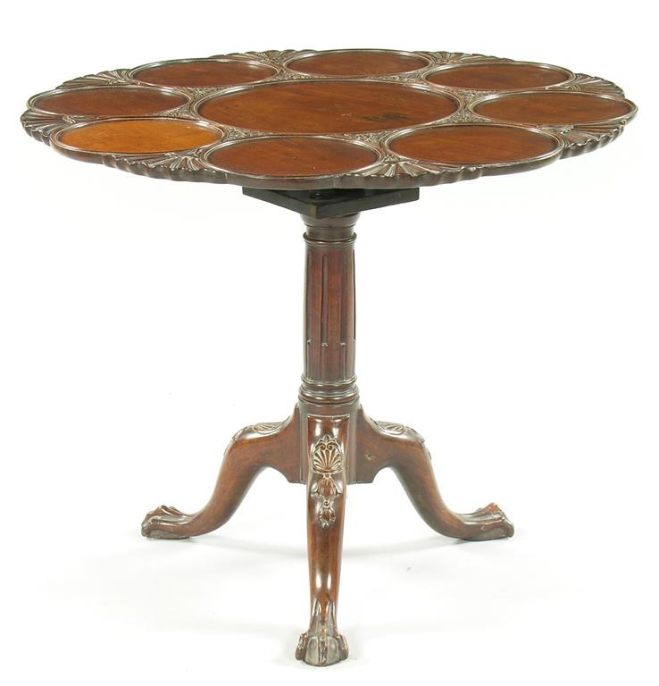 A carved mahogany supper table, the leafage and shell dished tilt top revolving on a birdcage to a stop fluted stem on anthemion and husk carved legs to claw and ball feet, 28.5in (72.4cm) h, 34in (86.4cm) dia. 18th century with later carving.