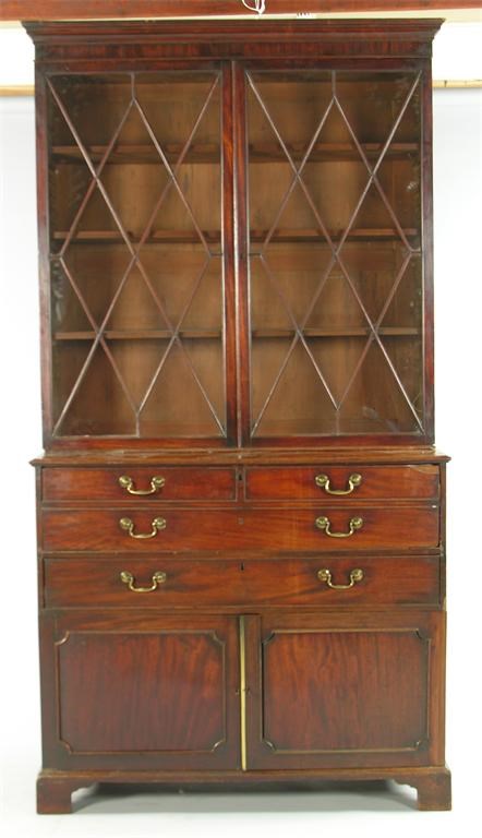 A George III mahogany secretaire bookcase, the detachable cornice above adjustable shelves enclosed by a pair of astragal glazed doors, the flase drawer front fall revealing pigeon holes and drawers above a long drawer, above a pair of cupboard doors enclosing two pine drawers, 93in (236.2cm) h, 50in (107.7cm) w, 22.5in (57cm) d.