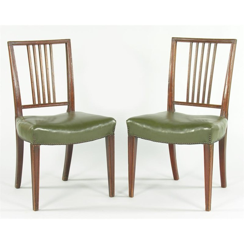 A set of six early 19th century mahogany side chairs, the moulded square backs with five vertical rails to later brass studded leatherette seats. (6)