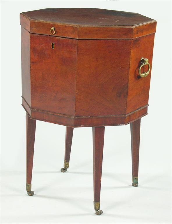 A late George III mahogany octagonal cellaret, the zinc lined interior partitioned for eight bottles, with a central plug, the square tapering legs on leather roller castors, 27.25in (69.5cm) h, 18.5in (47cm) w.