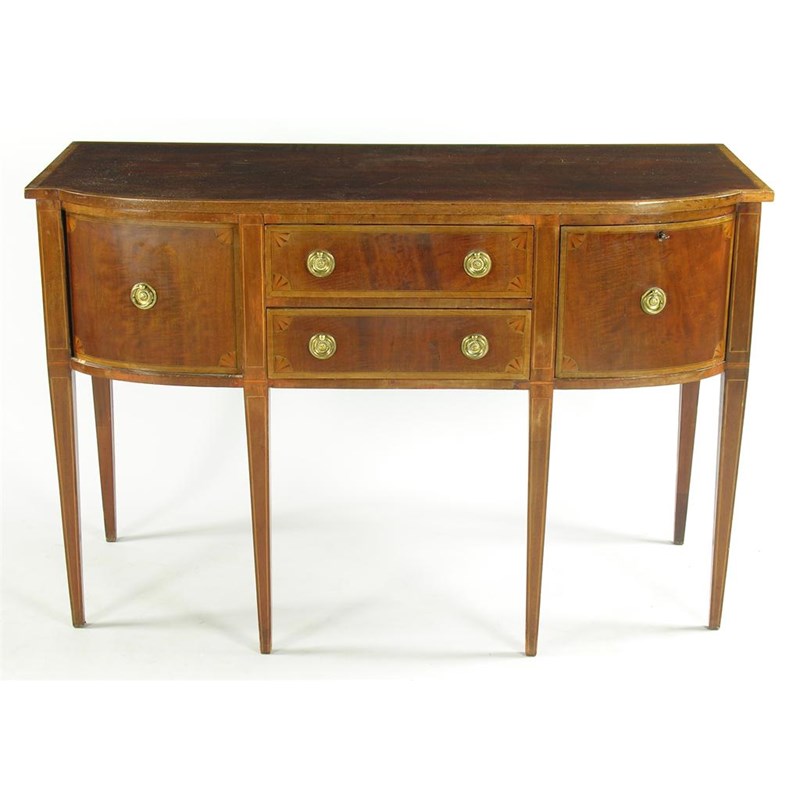 An Edwardian mahogany barrel front sideboard, sycamore banded and inlaid stringing, the front inlaid marquetry fans to the two central drawers, deep drawer and cupboard door, 36in (91.4cm) h, 54in (137cm) w, 23.5in (59.6cm) d.