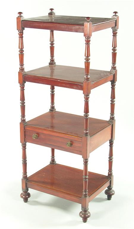 A Victorian mahogany four tier whatnot, with later satinwood banding and stringing, the drawer fitted later brass knob handles, 50in (127cm) h, 21in (53.3cm) w, 16in (40.6cm) d. Previously on castors.