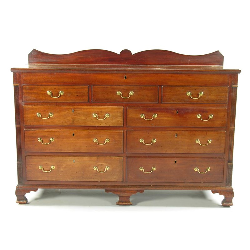 A late George III mahogany Lancaster mule chest, carved raised back to a moulded edge hinged top revealing hinged top till with two drawers to a front with three fake frieze drawers and arrangement of six long drawers, fitted brass handles, 47.5in (121cm) h, 67.5in (171.4cm) w, 22in (56cm) d. Ribbed angles with inlaid stringing on ogee bracket feet,