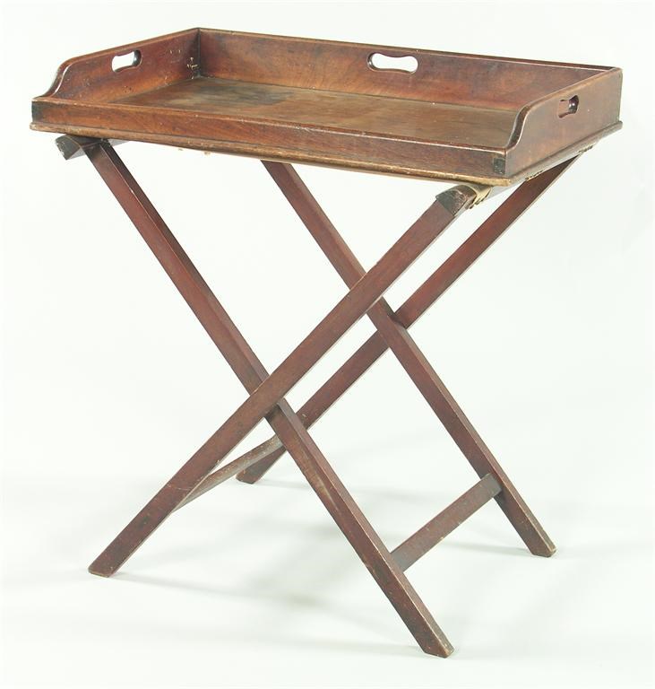 A 19th century mahogany butler's tray, the three quarter gallery with pierced hand grips on a folding stand, 31.75in (80.5cm) h, 29.75in (75.5cm) w, 20.5in (52cm) d.