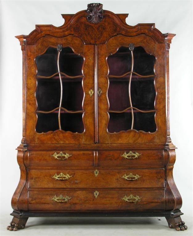 A late 19th century Dutch walnut cabinet on bomb chest, the arched moulded cornice with a central carved scroll and foliage surmount above a burr walnut frieze and a plush lined shaped shelved interior enclosed by a pair of shaped astragal glazed doors, the base with two short and two long drawers, fitted later cast brass handles, flanked by angled scroll on carved paw feet, 93.5in (237.5cm) h, 75in (190.5cm) w, 27in (68.5cm) d.