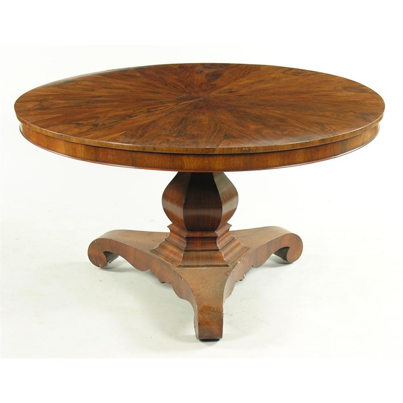 A 19th century rosewood centre table, the radiating veneered tilt top on a hexagonal faceted baluster stem, 29in (73.6cm) h, 51in (129cm) dia.