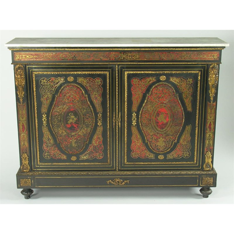 A late 19th century French ebonized, cut brass and tortoiseshell side cabinet, the white marble top above a banded frieze and a pair of raised panel doors, enclosing a lined shelf interior, 46.25in (167.5cm) h, 60.25in (153cm) w, 15.25in (38.6cm) d.