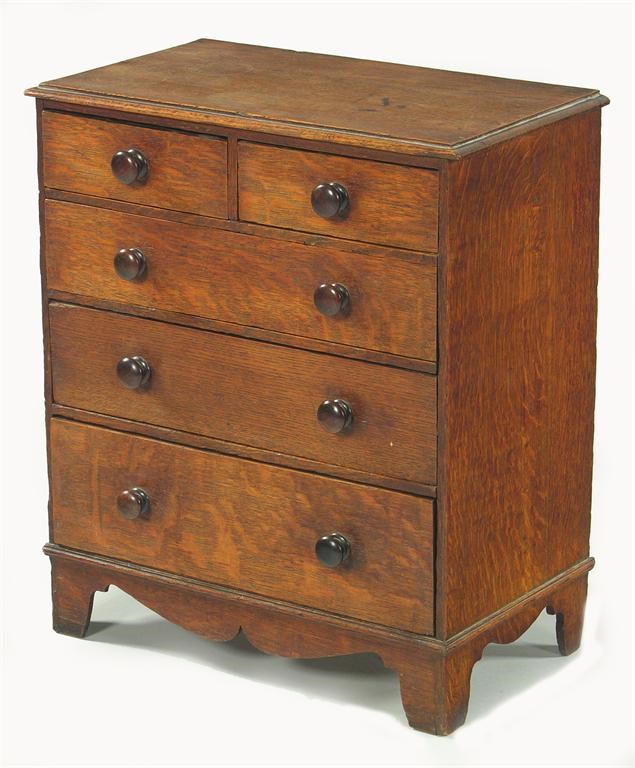 A late Victorian oak miniature chest, the drawer fitted turned mahogany handles, 18.25in (46.2cm) h, 16in (40.6cm) w, 9in (23cm) d.