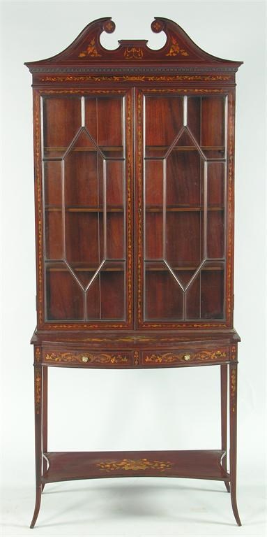 A late Victorian mahogany and marquetry inlaid display cabinet, the broken swan neck pediment above a pair of glazed tracery doors enclosing three shelves to a bow front stand with two frieze drawers, the square tapering legs united by a concave undertier, 79.75in (202.5cm) h, 33in (84cm) w, 17.25in (43.6cm) d.