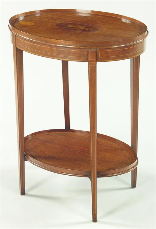A mahogany two tier oval table, satinwood banded and inlaid strung gallery tiers, the top one with a marquetry panel of musical trophies, 30.75in (78cm) h, 24.25in (61.5cm) w, 18in (45.6cm) d.