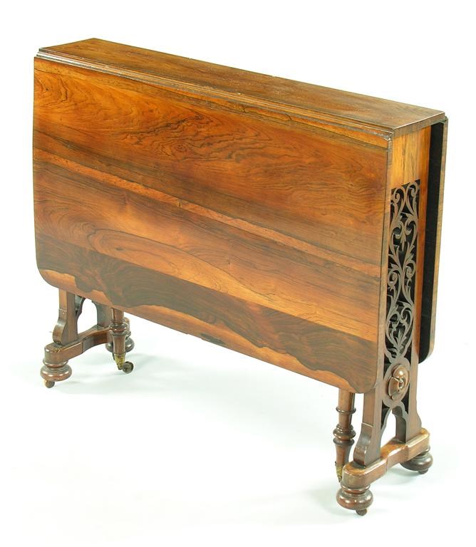 A Victorian rosewood sutherland table, the twin flap top on pierced end supports, on brass and wooden castors, 29.5in (75cm) h, 35in (89cm) w, 11in (28cm) d, closed.