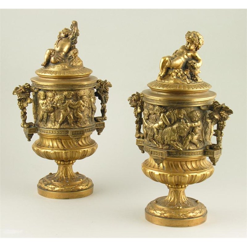 A pair of French bronze vases, with Bacchic friezes and fruiting vine handles, the differing covers to cylindrical zinc liners, 14in (35.5cm) h. (2)