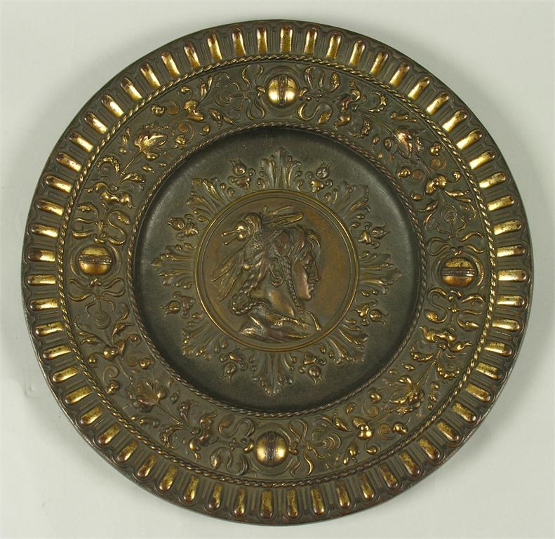 A late 19th century gilt bronze charger, the centre with a profile bust to foliage and orb decorated borders, 18.25in (46.2cm) dia.