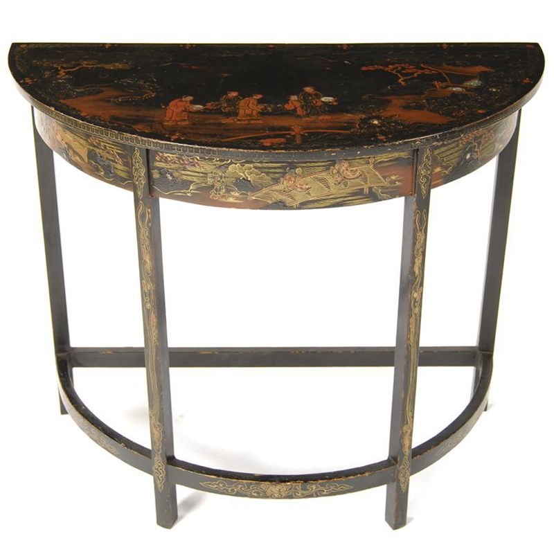 A black lacquer demi-lune side table, inlaid mother of pearl and decorated with chinoiserie, early 20th century, 30in (76.3cm) h, 35.75in (90.8cm) w, 18in (45.7cm) d.