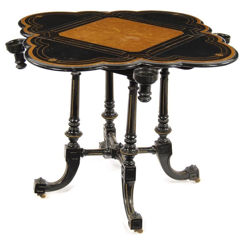 A Victorian ebonised and amboyna card table, with four trefoil shaped drop flaps and pull-out counter wells, on column supports mounted with gilt metal beads, on ceramic castors, 27.25in (69cm) h, 21in (53.2cm) w and d. One well damaged.