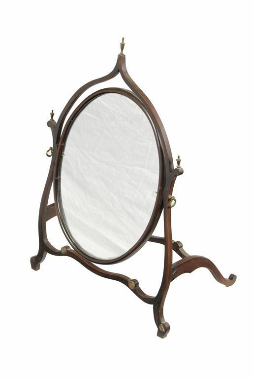 A George III style mahogany drawing table mirror, with an oval plate and open scroll frame having turned brass finials and applied ivory rondels, one and a half missing, 26in (66cm) h, 18.25in (46.5cm) w, 12.5in (32cm) d.