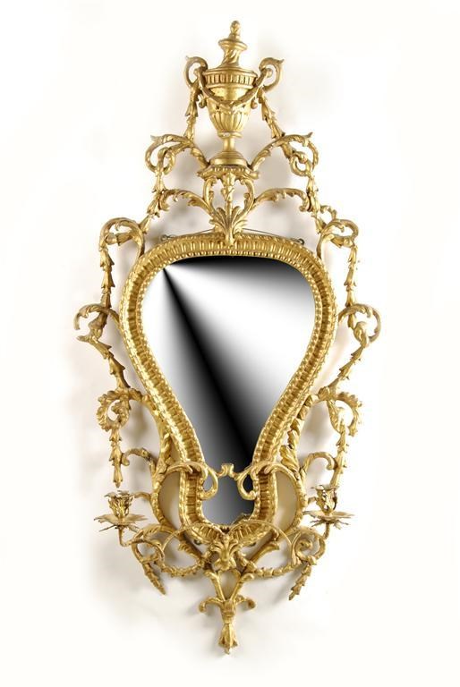 A 19th century giltwood and gesso girandole, with an inverted bell shape plate in an arcaded and bead edge frame, with an urn surmount issuing scrolling foliage, the base with a pair of gilt metal scroll branches, 46 x 22.5in (117 x 57cm). Losses and repairs.